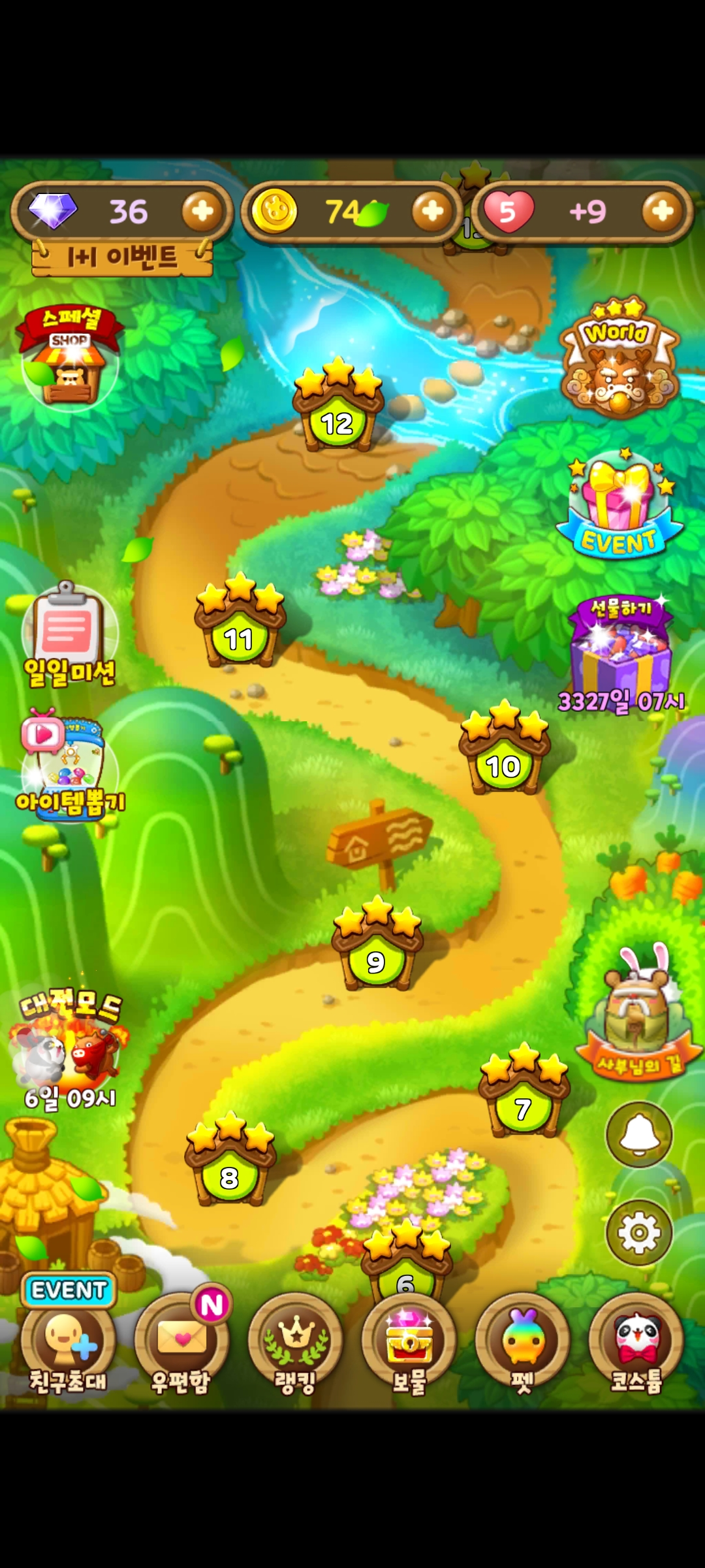 퍼즐 게임에서 많이 찾아볼 수 있는 스테이지 구조인데, 스테이지가 스크롤 형식으로 길을 따라 나열되어있고