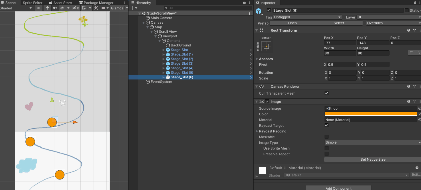 이렇게 Stage_Slot 프리팹을 길을 따라서 배치해야 하는데
