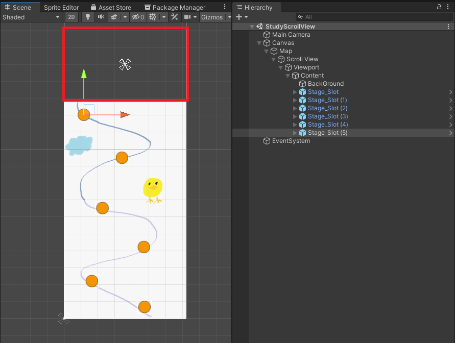 씬 뷰에서 스크롤뷰의 Content 사이즈 이상으로는 Background 가 보이지 않아서 스테이지 프리팹을 배치하는데 어려움이 있다.