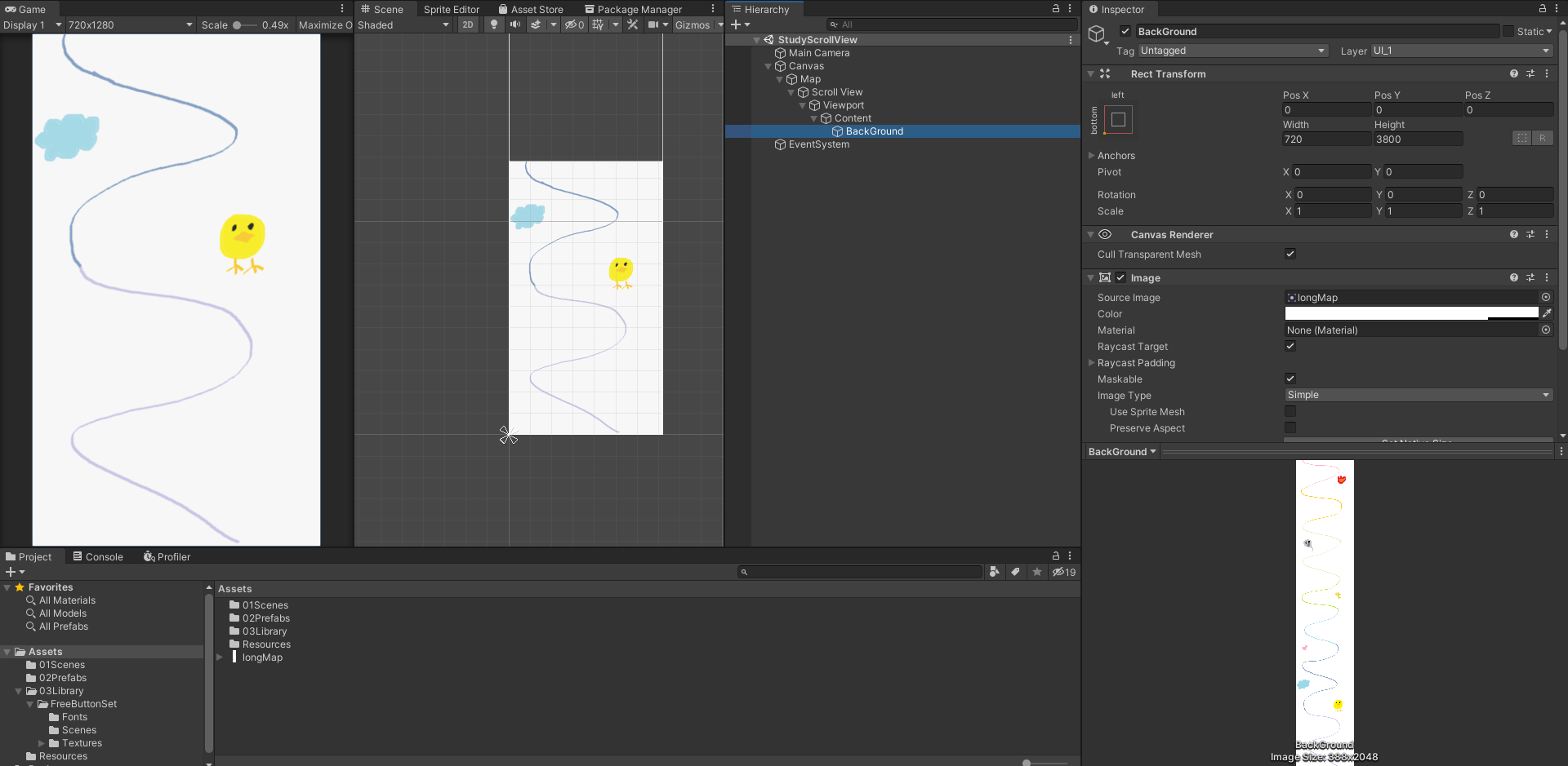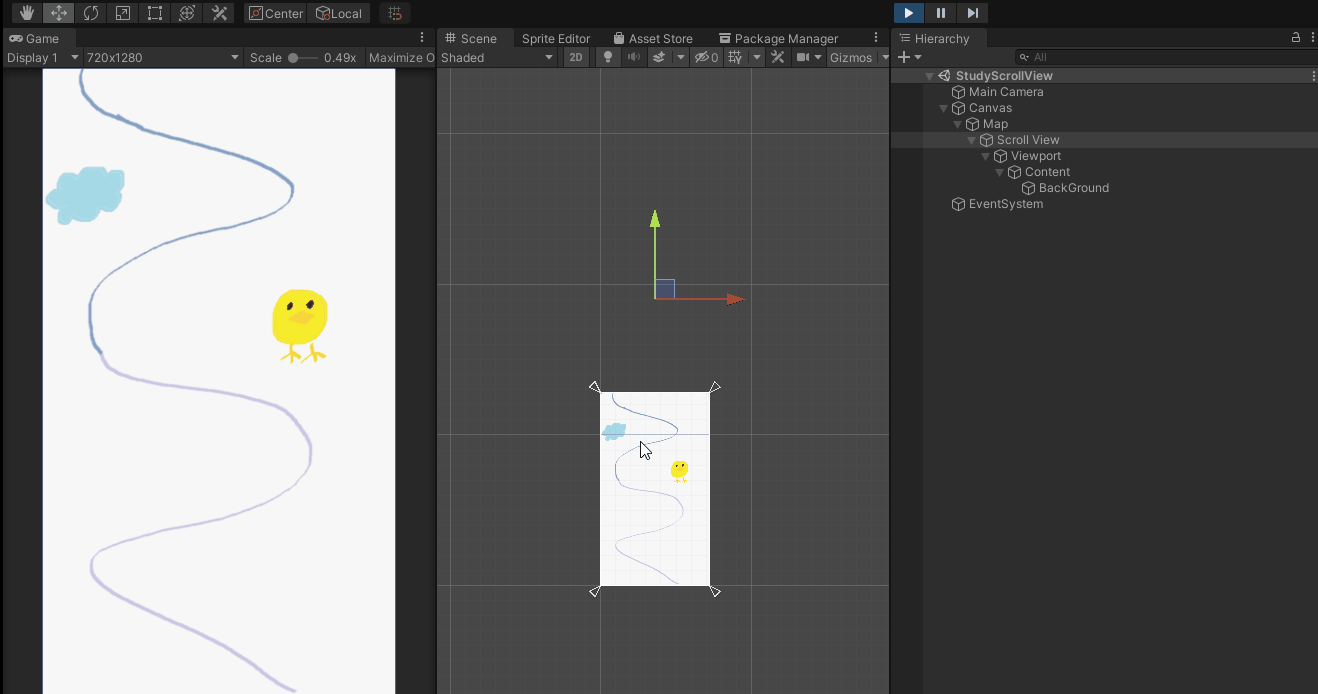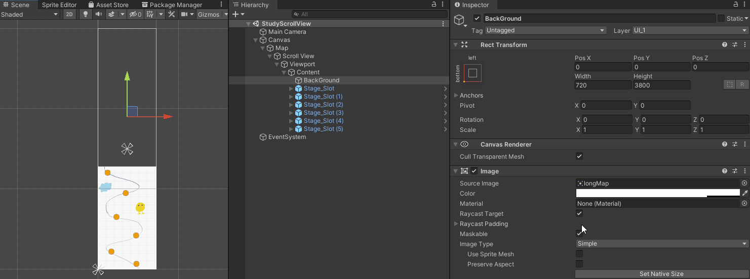 캔버스에 스크롤 뷰를 추가하고 Content에 Background 게임오브젝트를 추가해주었다. 그림 3