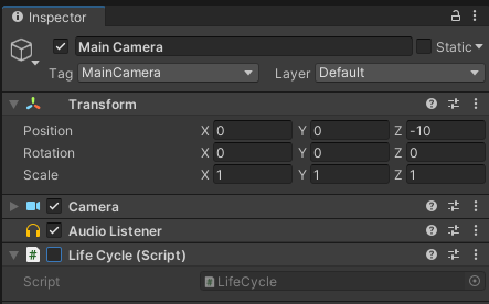 LifeCycle 스크립트를 작성해서 MainCamera에 넣어주었다. 그림 2