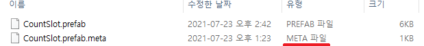 폴더를 확인해보면 PREFAB 파일과 META 파일이 같이 생성된 것을 확인할 수 있다.
