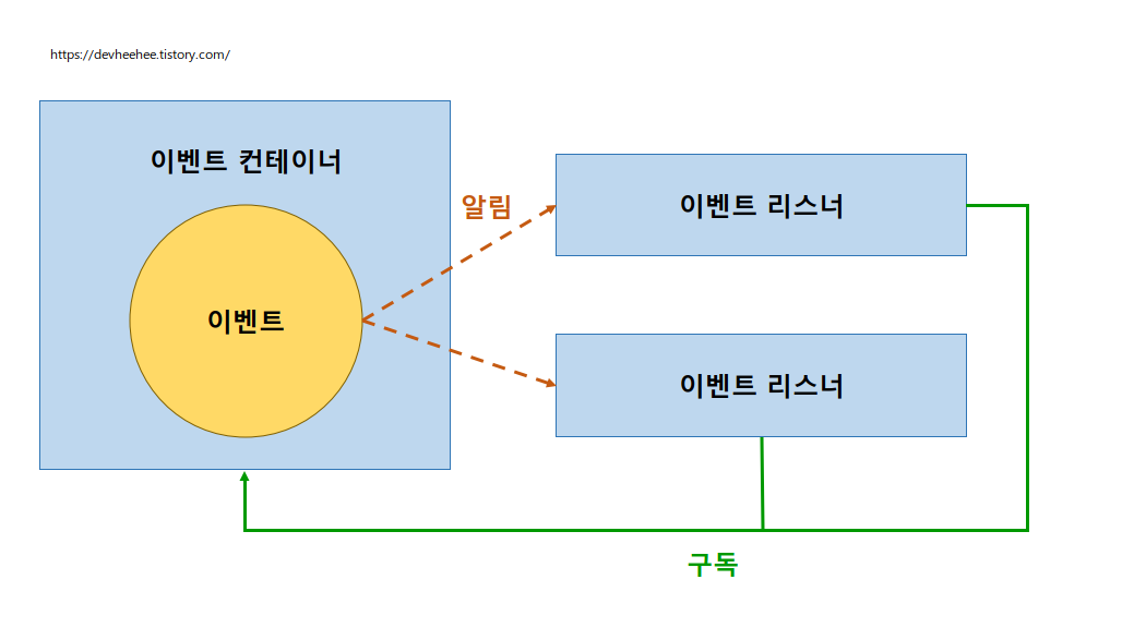 이벤트가 발생했을 때 이벤트를 구독하는 '구독자(Subscriber)'들이 알림을 받고 실행하게 된다.
