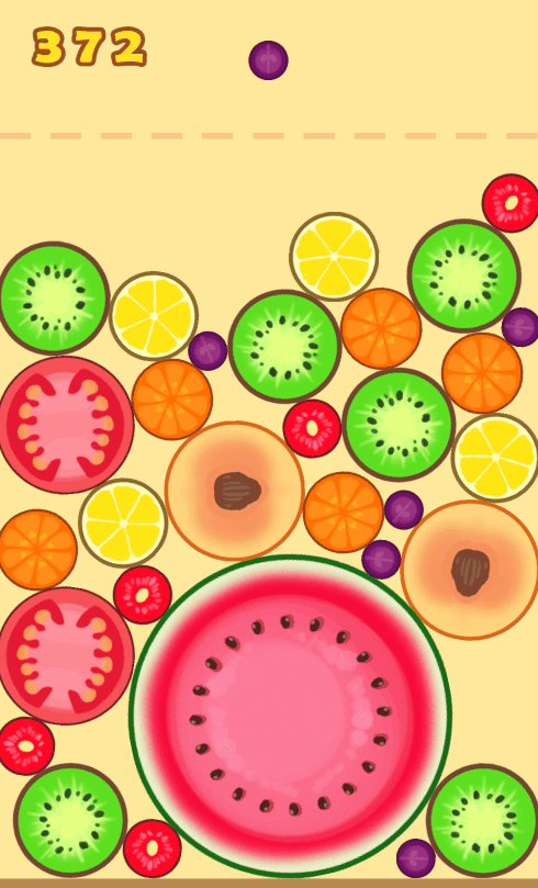 중앙 상단에서 포도, 체리, 귤, 레몬, 키위가 랜덤하게 Spawn되며 마우스로 클릭, 드래그해서 원하는 위치에서 마우스버튼 업하면 과일이 밑으로 떨어지고, 과일을 작은 순서대로 합쳐서 크게 만들다가 최종적으로 큰 수박을 만들면서 높은 점수를 얻는 게임이다.