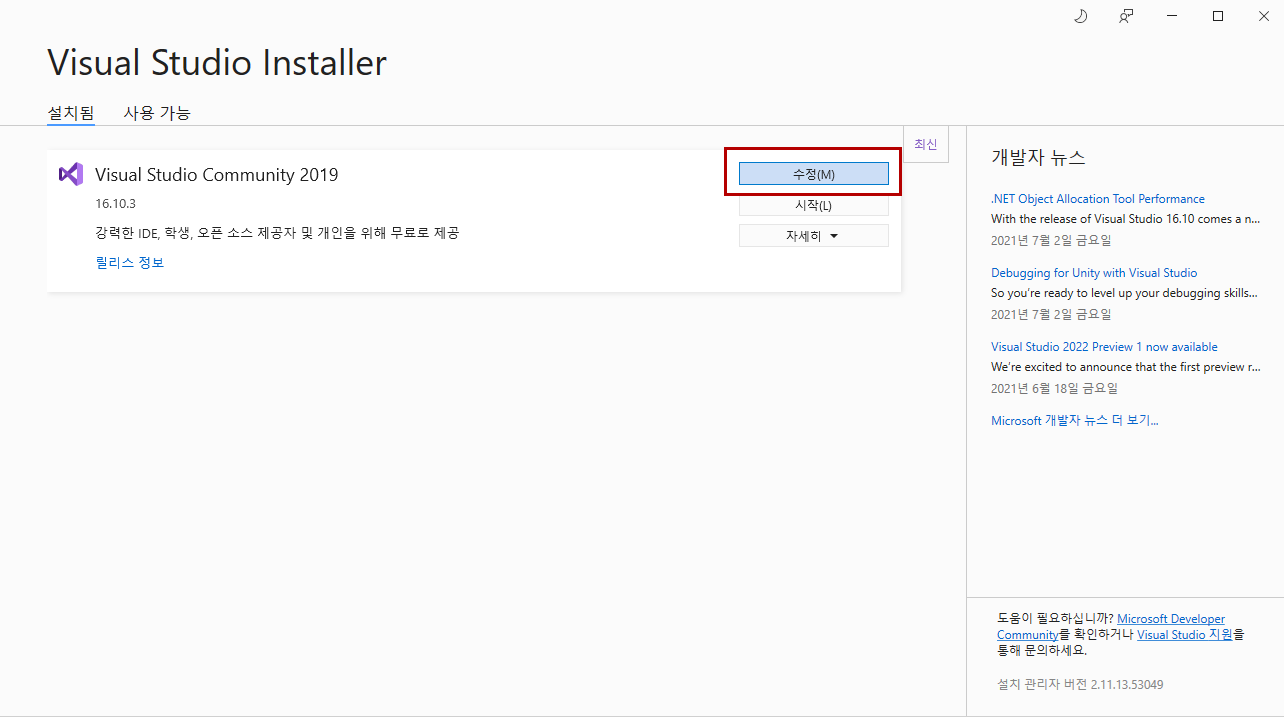 비쥬얼 스튜디오 인스톨러를 실행 후, 수정을 누른다.