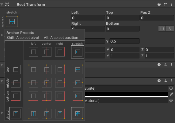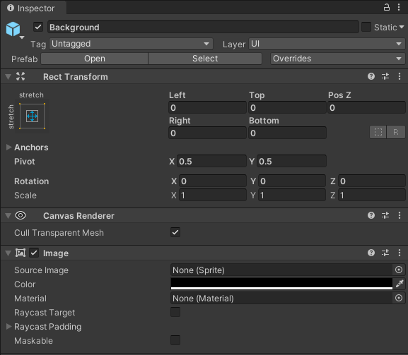 이 오브젝트는 캔버스에 꽉차게 검정색 배경에 채워넣기 위해 Anchor Preset을 Stretch로 설정했다.